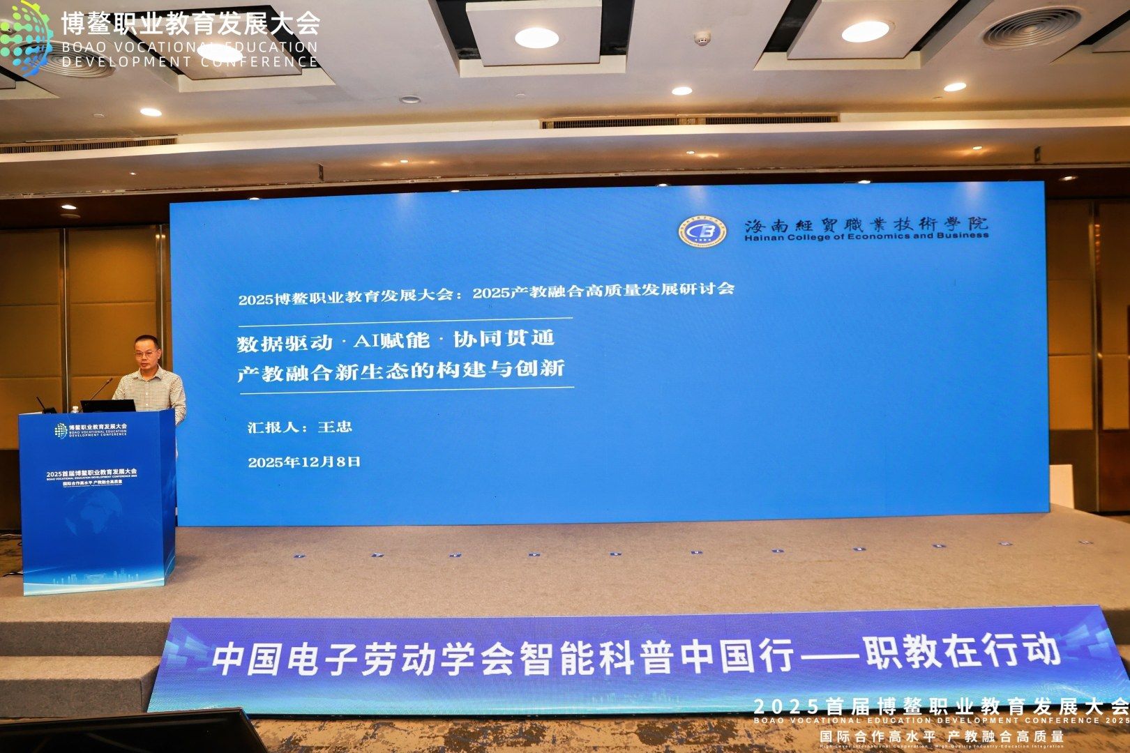 2025年12月5-8日,由博鳌职业教育发展大会组委会主办的“2025首届博鳌职业教育发展大会”在海南博鳌亚洲论坛国际会议中心隆重举行。在“中国电子劳动学会科普工作委员会2025年会暨智能科普中国行—职教在行动(海南站)”分论坛上,王忠院长受邀作主题报告,分享了学校在产教融合领域的创新探索与实践成果,引发与会专家学者的广泛关注。