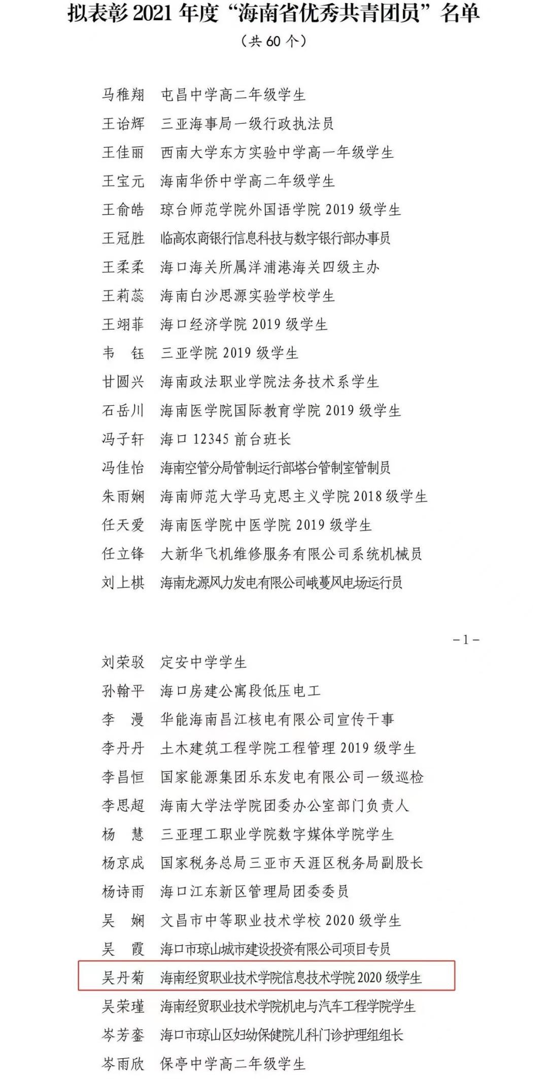 吴丹菊是太阳网集团tcy872220级软件技术1班的一名共青团员,现担任班长、学工办助理。大一学年总成绩排名专业第一,获得“国家励志奖学金”、“三好学生”、“优秀共青团员”、“优秀青年志愿者”等荣誉称号。学业优异的她,也不忘提升综合素质,2021年荣获“外教社·词达人杯”全国英语大学生高职组二等奖、第六届服务项目大赛优秀奖。此外还参加了2021年泛珠三角大学生计算机作品海南省赛暨“讯飞杯”(高职高专组),荣获二等奖。她用勤勉踏实的工作,默默无闻地奉献,走出了一名共青团员的奋斗轨迹。